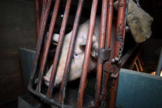 Sow in farrowing crate.